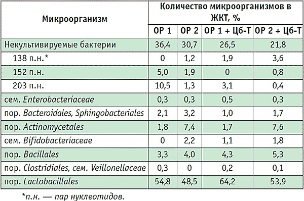 Таблица 2. Состав микроорганизмов в желудочно-кишечном тракте