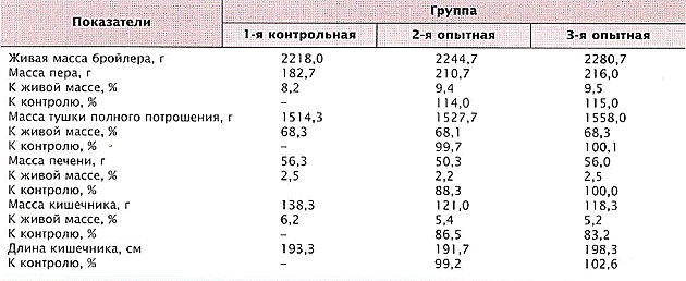 показала, что у бройлеров опытных групп относительная масса кишечника имела